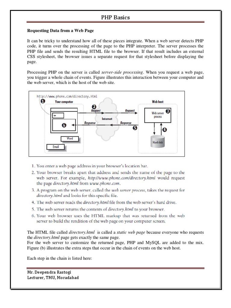 The HTML file called directory.html is called a static web page because everyone who requests the directory.html page gets exactly the same page. For the web server to customize the returned page, PHP and MySQL are added to the mix. Figure (b) illustrates the extra steps that occur in the chain of events on the web host. Each step in the chain is listed here: Mr. Deependra Rastogi Lecturer, TMU, Moradabad