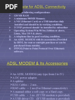 Type of CPEs ( Modems) supplied by BSNL 1. Type 1: One Ethernet port + one USB port ( Models: Huawei MT800, Huawei MT880, Huawei MT882, DareGlobal DB108). MT800 and DB108 do not have USB ports. 2. Type 2: One Ethernet port + One USB port + Wi-Fi (Models: Huawei WA1003A) 3. Type 3: Four Ethernet ports + One USB port. (Models: Huawei MT841) 4. Type 4: Four Ethernet ports + One USB port + Wi-Fi ( Models: Huawei MT841 with wi-fi module) Customer End requirements: 1. BSNL Landline. 2. Computer with i. Operating system: Linux/win2000/winNT/Win 98/WinXP or higher. For exploiting speed of Dataone to maximum, WIN XP will be better. ii. Memory: Can work with minimum memory but 64MB or above will give better experience. iii. One Ethernet port or USB port. INSTALLING USB DRIVER 1. For using USP port your PC should have USB port. Connect USB cable to Modem at one end and to PC at other end. Insert the driver CD supplied along with CPE.
