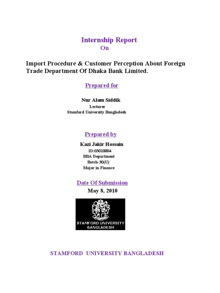 May 8, 2010 Nur Alam Siddik Lecturer Stamford University Bangladesh Subject: Submission of Internship Report. Dear Sir, It is my great pleasure to submit the internship report on "Import procedure and Customer perception about Foreign Trade Department of Dhaka Bank Limited" Which is a part of BBA Final Trimester to you for your consideration. I made sincere efforts to study related materials, documents, observe operations performed in Dhaka Bank Limited and Examine relevant records for preparation of the report. The whole experience of preparing this report has given me a scope to observe what actually happens in the real life and enable me to bridge the gap between academic learning and real life business situation to a great extent. Within the time limit, I have to make this report as comprehensive as possible. But there may be some mistakes due to various limitations. For this reason, I beg your kind consideration in this regard. Thank You. Yours Faithfully,