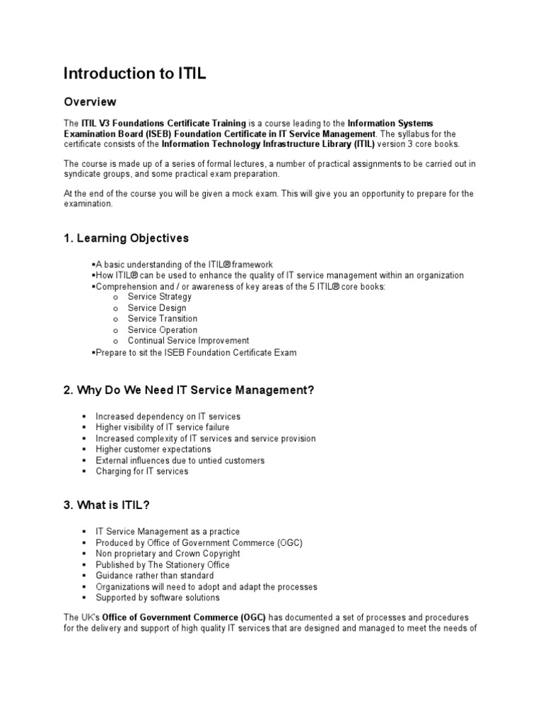 A basic understanding of the ITIL framework How ITIL can be used to enhance the quality of IT service management within an organization Comprehension and / or awareness of key areas of the 5 ITIL core books: o Service Strategy o Service Design o Service Transition o Service Operation o Continual Service Improvement Prepare to sit the ISEB Foundation Certificate Exam