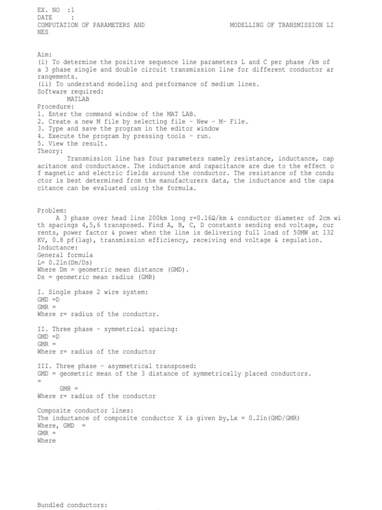 Aim: (i) To determine the positive sequence line parameters L and C per phase /km of a 3 phase single and double circuit transmission line for different conductor ar rangements. (ii) To understand modeling and performance of medium lines. Software required: MATLAB Procedure: 1. Enter the command window of the MAT LAB. 2. Create a new M file by selecting file New M- File. 3. Type and save the program in the editor window 4. Execute the program by pressing tools run. 5. View the result. Theory: Transmission line has four parameters namely resistance, inductance, cap acitance and conductance. The inductance and capacitance are due to the effect o f magnetic and electric fields around the conductor. The resistance of the condu ctor is best determined from the manufacturers data, the inductance and the capa citance can be evaluated using the formula. Problem: A 3 phase over head line 200km long r=0.16/km & conductor diameter of 2cm wi th spacings 4,5,6 transposed. Find A, B, C, D constants sending end voltage, cur rents, power factor & power when the line is delivering full load of 50MW at 132 KV, 0.8 pf(lag), transmission efficiency, receiving end voltage & regulation. Inductance: General formula L= 0.2ln(Dm/Ds) Where Dm = geometric mean distance (GMD). Ds = geometric mean radius (GMR) I. Single phase 2 wire system: GMD =D GMR = Where r= radius of the conductor. II. Three phase symmetrical spacing: GMD =D GMR = Where r= radius of the conductor III. Three phase asymmetrical transposed: GMD = geometric mean of the 3 distance of symmetrically placed conductors. = GMR = Where r= radius of the conductor Composite conductor lines: The inductance of composite conductor X is given by,Lx = 0.2ln(GMD/GMR) Where, GMD = GMR = Where