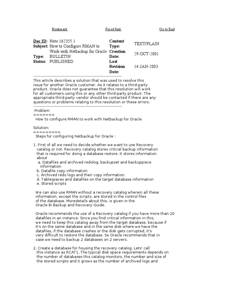 -------------------------------------------------------------------This article describes a solution that was used to resolve this issue for another Oracle customer. As it relates to a third-party product, Oracle does not guarantee that this resolution will work for all customers using this or any other third-party product. The appropriate third-party vendor should be contacted if there are any questions or problems relating to this resolution or these errors. -------------------------------------------------------------------Problem ======= How to configure RMAN to work with Netbackup for Oracle Solution: ========= Steps for configuring Netbackup for Oracle : 1. First of all we need to decide whether we want to use Recovery catalog or not. Recovery catalog stores critical backup information that is required for doing a database restore. It stores information about a. Datafiles and archived redolog, backupset and backuppiece information b. Datafile copy information c. Archived redo logs and their copy information d. Tablespaces and datafiles on the target database information e. Stored scripts We can also use RMAN without a recovery catalog wherein all these information, except the scripts, are stored in the control files of the database. Moredetails about this, is given in the Oracle 8i Backup and Recovery Guide. Oracle recommends the use of a Recovery catalog if you have more than 20 datafiles in an instance. Since you find critical information in this, we need to keep this catalog away from the target database, because if it's on the same database and in the same disk where we have the datafiles, if the database crashes or the disk gets corrupted, it's very difficult to restore the database. So Oracle recommends that in case we need to backup 2 databases on 2 servers. 2. Create a database for housing the recovery catalog. Lets' call this instance as RCAT1. The typical disk space requirements depends on the number of databases this catalog monitors, the number and size of the stored scripts and it grows as the number of archived logs and