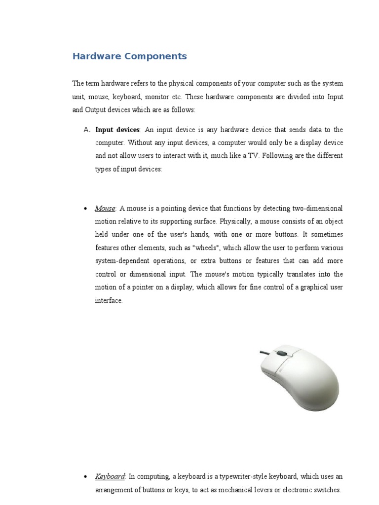The term hardware refers to the physical components of your computer such as the system unit, mouse, keyboard, monitor etc. These hardware components are divided into Input and Output devices which are as follows: