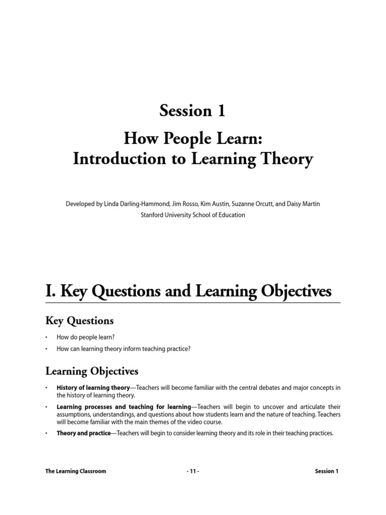 History of learning theoryTeachers will become familiar with the central debates and major concepts in the history of learning theory. Learning processes and teaching for learningTeachers will begin to uncover and articulate their assumptions, understandings, and questions about how students learn and the nature of teaching. Teachers will become familiar with the main themes of the video course. Theory and practiceTeachers will begin to consider learning theory and its role in their teaching practices.