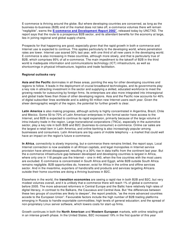 But where developing countries are concerned, as long as the business-to-business (B2B) end of the market does not take off, e-commerce volumes there will remain 1 negligible, warns the E-commerce and Development Report 2002 , released today by UNCTAD. The report says that the route to a prosperous B2B sector, and its attendant benefits for the economy at large, lies in joining regional and global supply chains. Prospects for that happening are good, especially given that the rapid growth in both e-commerce and Internet use is expected to continue. This applies particularly to the developing world, where penetration rates are lower. Internet use soared 30% last year, with one third of all new users in the developing world. E-commerce is also increasing in these countries, although more slowly, and that is particularly true of B2B, which comprises 95% of all e-commerce. The main impediment to the takeoff of B2B in the third world is inadequate information and communications technology (ICT) infrastructure, as well as shortcomings in physical infrastructure, logistics and trade facilitation. Regional outlooks vary Asia and the Pacific dominates in all these areas, pointing the way for other developing countries and regions to follow. It leads in the deployment of crucial broadband technologies, and its governments play a key role in attracting investment in the sector and supplying a skilled, educated workforce to meet the growing needs for outsourcing by foreign firms. Its enterprises are also more integrated into intraregional and global trade flows than those of other developing regions. Asia and the Pacific now accounts for 46% of digital subscriber lines worldwide and is adding 50 million new Internet users each year. Given the sheer demographic weight of the region, the potential for further growth is clear. Latin America is also making progress, although activity is highly concentrated in Argentina, Brazil, Chile and Mexico. Some 50-to-70% of Latin American enterprises in the formal sector have access to the Internet, and B2B is expected to continue its rapid expansion, primarily because of the large volume of intra-industry trade in the region. Large transnational corporations (TNCs), especially in the automotive sector, play a key role in both B2B and B2C (business-to-consumer) e-commerce. Online car sales are the largest e-retail item in Latin America, and online banking is also increasingly popular among businesses and consumers. Latin Americans are big users of mobile telephony a market that could well have an impact on the region's future e-commerce. In Africa, connectivity is slowly improving, but e-commerce there remains limited, the report says. Local Internet connection is now available in all African capitals, and legal monopolies in Internet service provision have almost disappeared, resulting in a 30% rise in data traffic from the continent last year. But the e-commerce infrastructure gap between developed and developing countries is largest in Africa, where only one in 118 people use the Internet one in 440, when the five countries with the most users are excluded. E-commerce is concentrated in South Africa and Egypt, while B2B outside South Africa remains negligible. B2B opportunities do, however, exist for Africa in the online and offline services sector. And in the meantime, exporters of handicrafts and products and services targeting Africans outside their home countries are doing a thriving business in B2C. Elsewhere in the world, the transition economies are seeing a rapid rise in both B2B and B2C, but very modest volumes overall, and it is unlikely that e-commerce there will reach 1% of global e-commerce before 2005. The more advanced reformers in Central Europe and the Baltic have relatively high rates of digital literacy, in contrast to the Balkans, the Caucasus and Central Asia. But the differences between these two groups of countries are likely to deepen, the report predicts, as the more advanced countries accede to the European Union. Favourable factors include the high number of B2B trading platforms emerging in Russia to handle exportable commodities; high levels of general education; and the spread of non-proprietary Linux server software, which lowers costs for start-up firms. Growth continues in both the North American and Western European markets, with online retailing still in an intense growth phase. In the United States, B2C increased 19% in the first quarter of this year