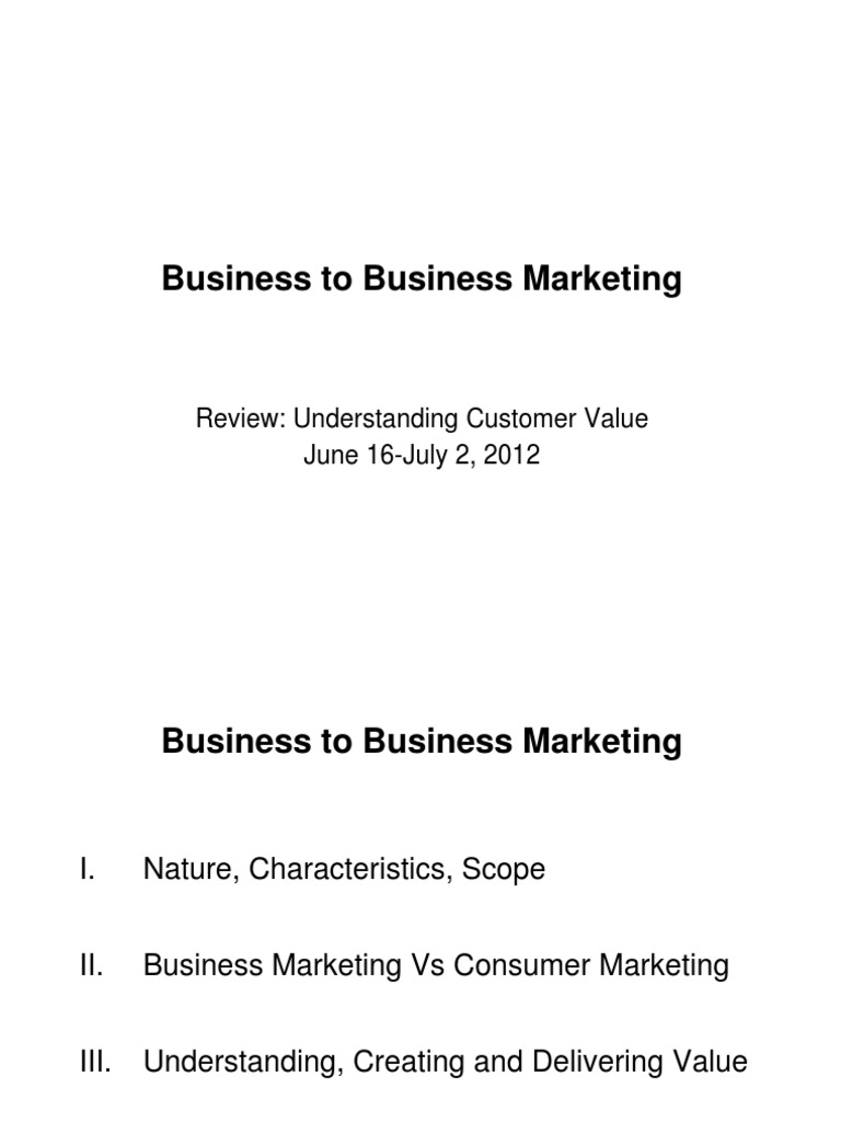 Nature, Characteristics, Scope Business Marketing Vs Consumer Marketing Understanding, Creating and Delivering Value