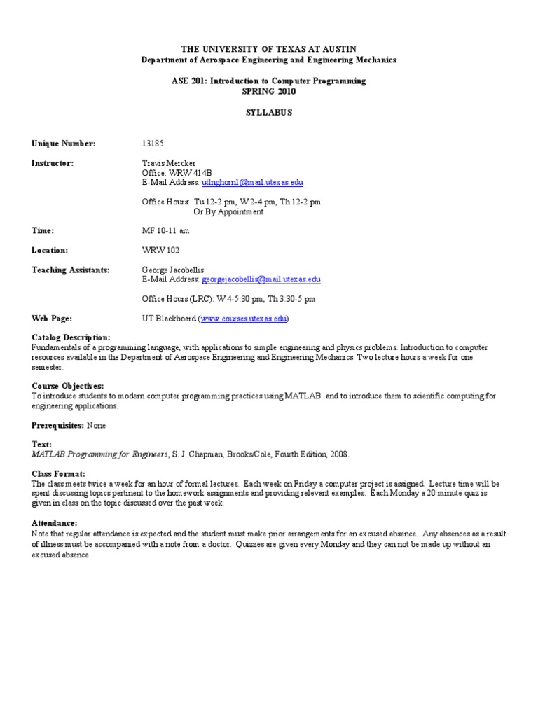 Catalog Description: Fundamentals of a programming language, with applications to simple engineering and physics problems. Introduction to computer resources available in the Department of Aerospace Engineering and Engineering Mechanics. Two lecture hours a week for one semester. Course Objectives: To introduce students to modern computer programming practices using MATLAB and to introduce them to scientific computing for engineering applications. Prerequisites: None Text: MATLAB Programming for Engineers, S. J. Chapman, Brooks/Cole, Fourth Edition, 2008. Class Format: The class meets twice a week for an hour of formal lectures. Each week on Friday a computer project is assigned. Lecture time will be spent discussing topics pertinent to the homework assignments and providing relevant examples. Each Monday a 20 minute quiz is given in class on the topic discussed over the past week. Attendance: Note that regular attendance is expected and the student must make prior arrangements for an excused absence. Any absences as a result of illness must be accompanied with a note from a doctor. Quizzes are given every Monday and they can not be made up without an excused absence.
