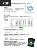 Grading: 40% Weekly Homework Assignments (1 Drop) 40% Quizzes (2 Drops) 10% Final Quiz 10% Final Project Grades will be posted weekly using eGradebook which is available through the Class Information Pages (CLIPS) and it is the students responsibility to check grades frequently and to notify the instructor immediately of any discrepancy. Note: If your quiz average is 10 points or more below your homework assignment average, then your final grade may be determined by your quiz average. Homework Policy: Homework assignments are assigned weekly and students will have approximately one week to complete the assignment (with the exception of the final project which will last for two weeks). Homework is due BEFORE the beginning of class. Homework must be handed to the instructor before lecture begins. Assignments turned in after lecture begins will be considered late. Two late programs will be accepted up to one week late and will be graded for 75% credit. Assignments that are more than one week late will not be accepted without prior approval. In addition, one assignment grade will be dropped at the end of the semester. Students are expected to complete their assignments independently. Students are encouraged to discuss class topics and general programming procedures amongst themselves; however, any sharing of code will be considered an act of academic dishonesty and will be dealt with severely under the Code of Conduct of the university. Examinations: A 20 minute quiz will be given each Monday at the end of class. Quizzes can not be made up unless an absence is due to official UT business or has been pre-approved by the instructor. The two lowest quiz grades throughout the semester will be dropped. In addition, a final, comprehensive quiz will be given the final day of class. This quiz must be taken and cannot be dropped. NO FINAL EXAM WILL BE GIVEN. Computer: The computer will be used weekly to complete programming assignments. MATLAB will be used for all assignments and is available for use in the LRC (WRW 205). Design Assignments: None Laboratory Assignments: None Class Topics / Outline: 1. Introduction to MATLAB (using MATLAB, classes, calculations, arrays, etc.) 2. IF Statements 3. While Loops 4. For Loops 5. Plotting 6. Functions 7. Symbolic Calculations This list is not inclusive of every topic to be covered but is a basic outline of the main topics of the class. Knowledge, Skills, and Abilities Students Should Have Before Entering This Course: None Knowledge, Skills, and Abilities Students Gain from this Course (Learning Outcomes): Programming in MATLAB and the ability to incorporate engineering phenomena into a working computer model. Impact On Subsequent Courses In Curriculum: The skill of subdividing problems into logical sequences of steps is applicable to all future engineering courses. MATLAB computing plays an important role in many ASE classes.