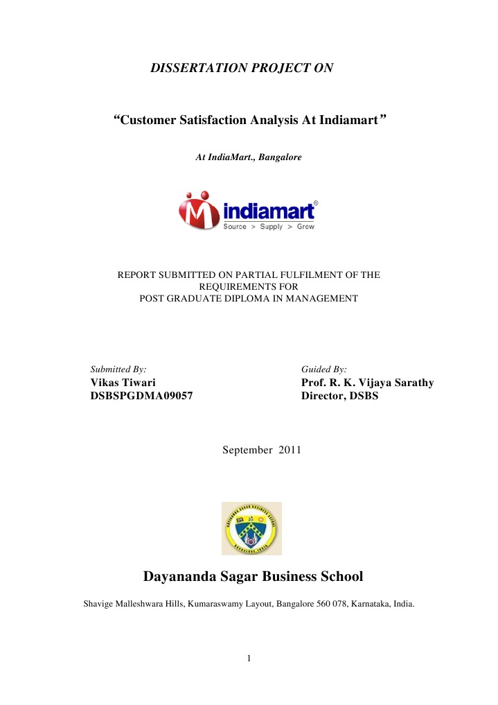This is to certify that the report titled Customer Satisfaction Analysis At Indiamart has been prepared under my guidance and supervision the report is submitted in partial fulfillment of the requirement for the award of Post Graduate Diploma in Management (Approved by AICTE) by Vikas Tiwari, Reg No DSBSPGDMA09057 and this report / study has not formed a basis for the award of any degree or diploma in any university / institution.