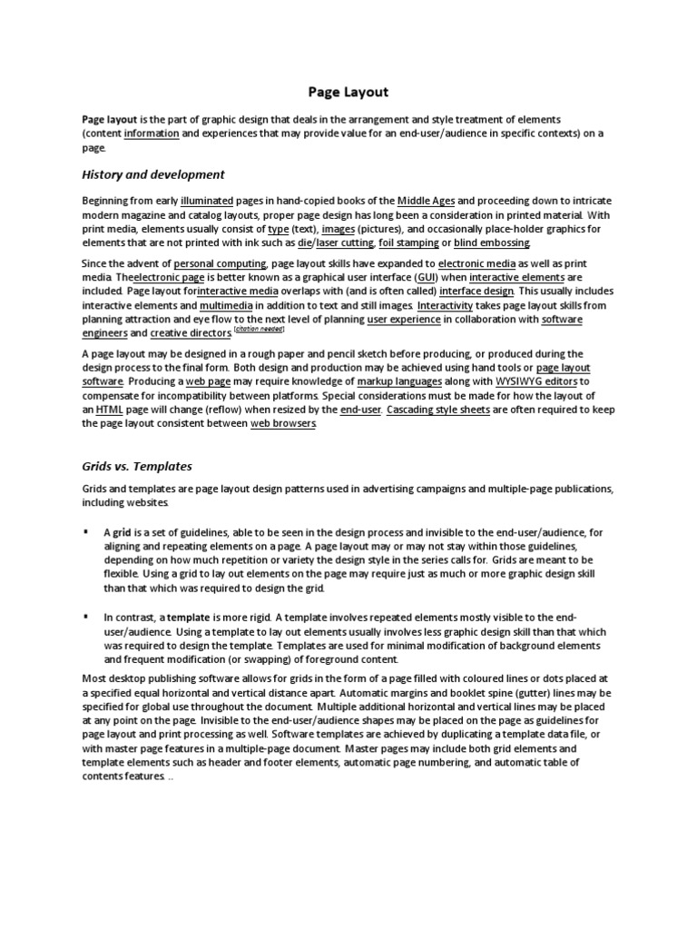 Beginning from early illuminated pages in hand-copied books of the Middle Ages and proceeding down to intricate modern magazine and catalog layouts, proper page design has long been a consideration in printed material. With print media, elements usually consist of type (text), images (pictures), and occasionally place-holder graphics for elements that are not printed with ink such as die/laser cutting, foil stamping or blind embossing. Since the advent of personal computing, page layout skills have expanded to electronic media as well as print media. Theelectronic page is better known as a graphical user interface (GUI) when interactive elements are included. Page layout forinteractive media overlaps with (and is often called) interface design. This usually includes interactive elements and multimedia in addition to text and still images. Interactivity takes page layout skills from planning attraction and eye flow to the next level of planning user experience in collaboration with software [citation needed] engineers and creative directors. A page layout may be designed in a rough paper and pencil sketch before producing, or produced during the design process to the final form. Both design and production may be achieved using hand tools or page layout software. Producing a web page may require knowledge of markup languages along with WYSIWYG editors to compensate for incompatibility between platforms. Special considerations must be made for how the layout of an HTML page will change (reflow) when resized by the end-user. Cascading style sheets are often required to keep the page layout consistent between web browsers.