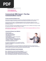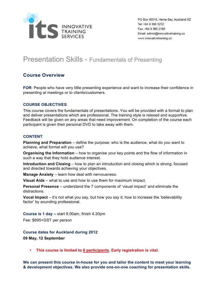 FOR: People who have very little presenting experience and want to increase their confidence in presenting at meetings or to clients/customers. COURSE OBJECTIVES: This course covers the fundamentals of presentations. You will be provided with a format to plan and deliver presentations which are professional. The training style is relaxed and supportive. Feedback will be given on any areas that need improvement. On completion of the course each participant is given their personal DVD to take away with them. CONTENT: Planning and Preparation define the purpose; who is the audience, what do you want to achieve, what format will you use? Organising the Information how to organise your key points and the flow of information in such a way that they hold audience interest. Introduction and Closing how to plan an introduction and closing which is strong, focused and directed towards achieving your objectives. Manage Anxiety learn how deal with nervousness. Visual Aids what to use and how to use them for maximum impact. Personal Presence understand the 7 components of visual impact and eliminate the distractions. Vocal Impact its not what you say, but how you say it; how to increase the believability factor by sounding professional. Course is 1 day start 9.00am, finish 4.30pm Fee: $695+GST per person Course dates for Auckland during 2012: 09 May, 12 September This course is limited to 6 participants. Early registration is vital.