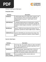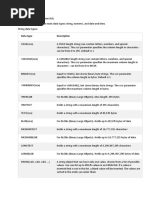 Text types: Data type CHAR(size) Description Holds a fixed length string (can contain letters, numbers, and special characters). The fixed size is specified in parenthesis. Can store up to 255 characters Holds a variable length string (can contain letters, numbers, and special characters). The maximum size is specified in parenthesis. Can store up to 255 characters. Note: If you put a greater value than 255 it will be converted to a TEXT type Holds a string with a maximum length of 255 characters Holds a string with a maximum length of 65,535 characters For BLOBs (Binary Large OBjects). Holds up to 65,535 bytes of data Holds a string with a maximum length of 16,777,215 characters For BLOBs (Binary Large OBjects). Holds up to 16,777,215 bytes of data