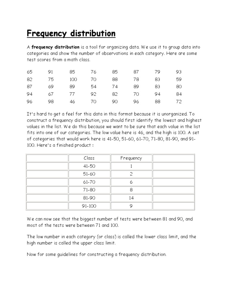 It's hard to get a feel for this data in this format because it is unorganized. To construct a frequency distribution, you should first identify the lowest and highest values in the list. We do this because we want to be sure that each value in the list fits into one of our categories. The low value here is 46, and the high is 100. A set of categories that would work here is 41-50, 51-60, 61-70, 71-80, 81-90, and 91100. Here's a finished product : Class 41-50 51-60 61-70 71-80 81-90 91-100 Frequency 1 2 6 8 14 9
