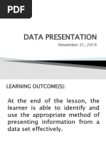 A tabular presentation of a set of quantitative data which shows for each class the fraction of the total frequency with values less than the upper class limit. A graphical presentation of data, where the horizontal axis shows the range of data values and each observation is plotted as a dot above the axis. A graphical method of presenting a frequency or a relative frequency distribution. A graphical method of presenting a cumulative frequency distribution or a cumulative relative frequency distribution.