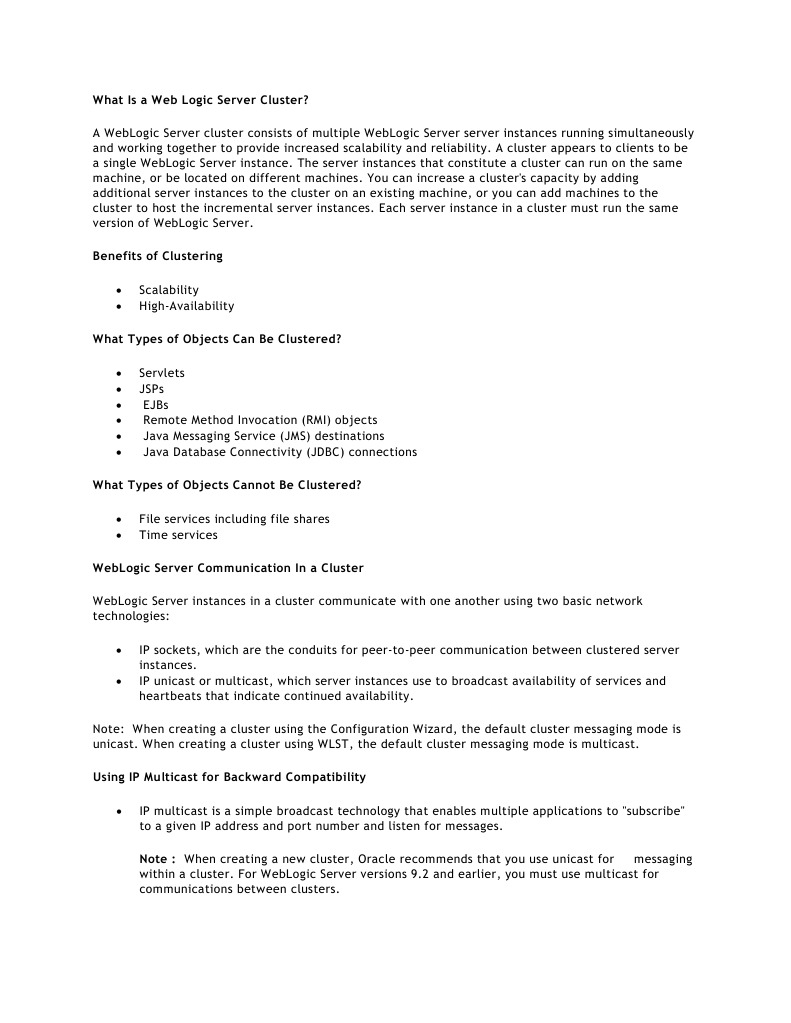 Why does WebLogic use IP multicast? A WebLogic Cluster is a group of WebLogic servers which provides similar services, with resilience (if a server crashes and exits the cluster, it can rejoin the cluster later), high availability (if a server in the cluster crashes, other servers in the cluster can continue the provision of services) and load balancing (the load on all servers in a cluster can be uniformly distributed) for an application deployed on a WebLogic cluster. WebLogic makes these beneficial clustering features possible by using IP Multicast for the following: (1) Cluster heartbeats: All servers in a WebLogic cluster must always know which servers are part of the cluster. To make this possible, each server in the cluster uses IP multicast to broadcast regular "heartbeat" messages that advertise its availability.