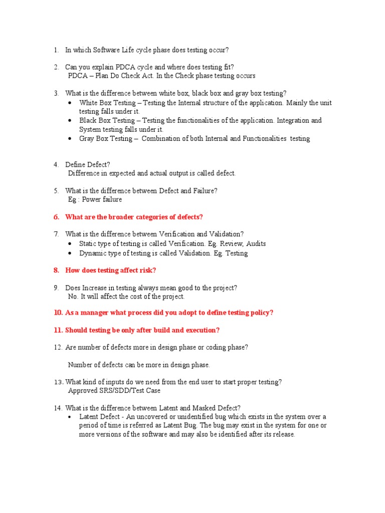 Can you explain PDCA cycle and where does testing fit? PDCA Plan Do Check Act. In the Check phase testing occurs 3. What is the difference between white box, black box and gray box testing? White Box Testing Testing the Internal structure of the application. Mainly the unit testing falls under it. Black Box Testing Testing the functionalities of the application. Integration and System testing falls under it. Gray Box Testing Combination of both Internal and Functionalities testing 4. Define Defect? Difference in expected and actual output is called defect. 5. What is the difference between Defect and Failure? Eg : Power failure 6. What are the broader categories of defects? 7. What is the difference between Verification and Validation? Static type of testing is called Verification. Eg. Review, Audits Dynamic type of testing is called Validation. Eg. Testing 8. How does testing affect risk? 9. Does Increase in testing always mean good to the project? No. It will affect the cost of the project. 10. As a manager what process did you adopt to define testing policy? 11. Should testing be only after build and execution? 12. Are number of defects more in design phase or coding phase? Number of defects can be more in design phase.