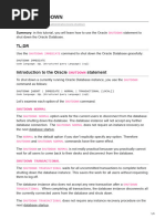 Shutting Down with the &O$'23 Clause 1he &O$'23 clause is optional* because this is the de+ault shutdown method i+ no clause is pro!ided. &ormal database shutdown proceeds with the +ollowing conditions4 &o new connections are allowed a+ter the statement is issued. )e+ore the database is shut down* the database waits +or all currentl# connected users to disconnect +rom the database. 1he ne5t startup o+ the database will not require an# instance reco!er# procedures. Shutting Down with the I'' DI21 Clause 1o initiate an automated and unattended bac0up (hen a power shutdown is going to occur soon (hen the database or one o+ its applications is +unctioning irregularl# and #ou cannot contact users to as0 them to log o++ or the# are unable to log o++ 1o shut down a database immediatel#* use the SHU1DO(& command with the I'' DI21 clause4 control +ile !er# Oracle Database has a control +ile* which is a small binar# +ile that records the ph#sical structure o+ the database. 1he control +ile includes4 1he database name &ames and locations o+ associated data+iles and redo log +iles 1he timestamp o+ the database creation 1he current log sequence number Chec0point in+ormation