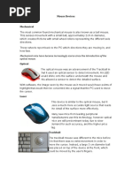 set at right angles to each other. As the ball moves these shafts rotate, and the rotation is measured by sensors within the mouse. The distance and direction information from the sensors is then transmitted to the computer, and the computer moves the graphical pointer on the screen by following the movements of the mouse. Another common mouse is the optical mouse. This device is very similar to the conventional mouse but uses visible or infrared light instead of a roller-ball to detect the changes in position. Mini-mouse A Mini-mouse is a small egg-sized mouse for use with laptop computers; usually small enough for use on a free area of the laptop body itself, it is typically optical, includes a retractable cord and uses a USB port to save battery life.