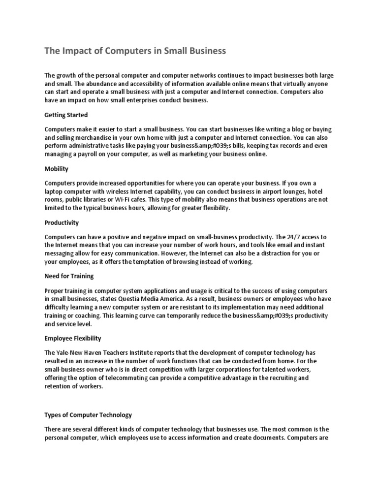 Impact in Service Businesses Service businesses tend to use personal computers to directly manipulate data. They work to analyze data and create documents, passing data onto other employees when necessary. This is accomplished using business networks that help manage and protect data that can be exchanged between various business departments as needed. It is not difficult to get computer professionals to agree that computers have a significant impact on society. It is rather more difficult to get them to agree on why they impact as they do. This paper discusses several characteristics of computer technology that may be at the center of the effects. It is intended that this list become a focal point around which the design of new technology can revolve, in order to anticipate the social consequences of a new product and mitigate any potential negative effects it may have on society.