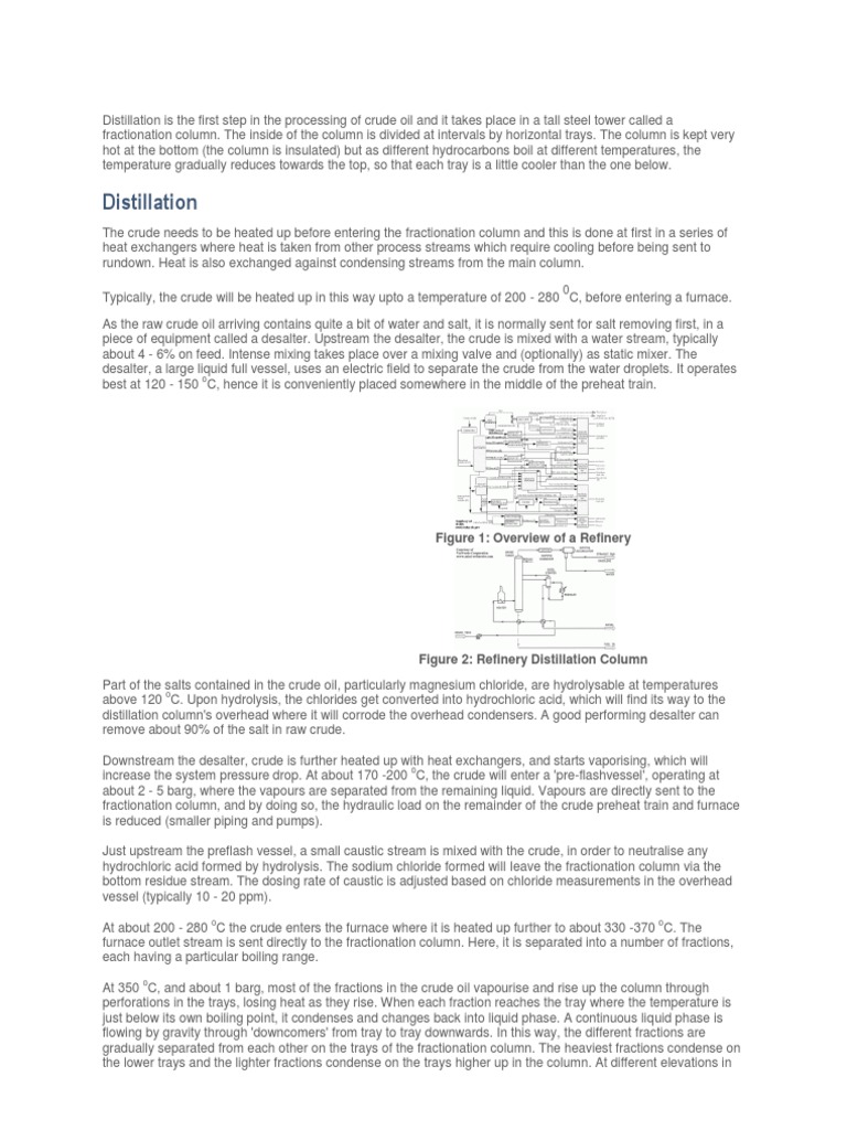 Figure 2: Refinery Distillation Column Part of the salts contained in the crude oil, particularly magnesium chloride, are hydrolysable at temperatures 0 above 120 C. Upon hydrolysis, the chlorides get converted into hydrochloric acid, which will find its way to the distillation column's overhead where it will corrode the overhead condensers. A good performing desalter can remove about 90% of the salt in raw crude. Downstream the desalter, crude is further heated up with heat exchangers, and starts vaporising, which will 0 increase the system pressure drop. At about 170 -200 C, the crude will enter a 'pre-flashvessel', operating at about 2 - 5 barg, where the vapours are separated from the remaining liquid. Vapours are directly sent to the fractionation column, and by doing so, the hydraulic load on the remainder of the crude preheat train and furnace is reduced (smaller piping and pumps). Just upstream the preflash vessel, a small caustic stream is mixed with the crude, in order to neutralise any hydrochloric acid formed by hydrolysis. The sodium chloride formed will leave the fractionation column via the bottom residue stream. The dosing rate of caustic is adjusted based on chloride measurements in the overhead vessel (typically 10 - 20 ppm). At about 200 - 280 C the crude enters the furnace where it is heated up further to about 330 -370 C. The furnace outlet stream is sent directly to the fractionation column. Here, it is separated into a number of fractions, each having a particular boiling range. At 350 C, and about 1 barg, most of the fractions in the crude oil vapourise and rise up the column through perforations in the trays, losing heat as they rise. When each fraction reaches the tray where the temperature is just below its own boiling point, it condenses and changes back into liquid phase. A continuous liquid phase is flowing by gravity through 'downcomers' from tray to tray downwards. In this way, the different fractions are gradually separated from each other on the trays of the fractionation column. The heaviest fractions condense on the lower trays and the lighter fractions condense on the trays higher up in the column. At different elevations in