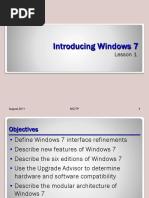 Windows 7 Improvements Windows 7 Editions: Starter, Home Basic, Home Premium, Professional, Enterprise, Ultimate Windows 7 Taskbar Pin applications to taskbar / no Quick Launch Jump Lists Right click Word & go to Recent Documents, right click taskbar icon New Preview Pane Preview text, music, picture, HTML, video, Office (w/ Office) and PDF (w/ Adobe) files Windows Touch Support for touch screen Windows XP Mode Windows XP in Virtual PC to run XP applications Simple Home Networking (HomeGroups) HomeGroups are just an easier way to set up a network. All versions are supported but Starter and Home Basic cant create HomeGroups Device Stage Shows a picture of a compatible connected device, supports Bluetooth and Wireless as well View Available Networks (VAN) Shows the networks available (wireless as well) in the notification tray Internet Explorer 8 Faster and more efficiently with new search features, address bars, and favorites Instant Search Quickly access search requests without typing in the entire search criteria. (Uses browser history as well to narrow down the suggestion) Accelerators shortcuts (search for an address and able to view the map next to the link). Web Slices Instances on a website that you can access without the need of accessing the site itself Aero Peek Allows you to look at a window while other windows are transparent Aero Snap Allows you to snap windows side by side