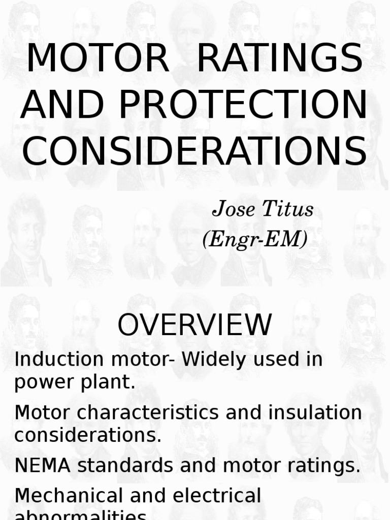 Induction motor- Widely used in power plant. Motor characteristics and insulation considerations. NEMA standards and motor ratings. Mechanical and electrical abnormalities. Protection considerations