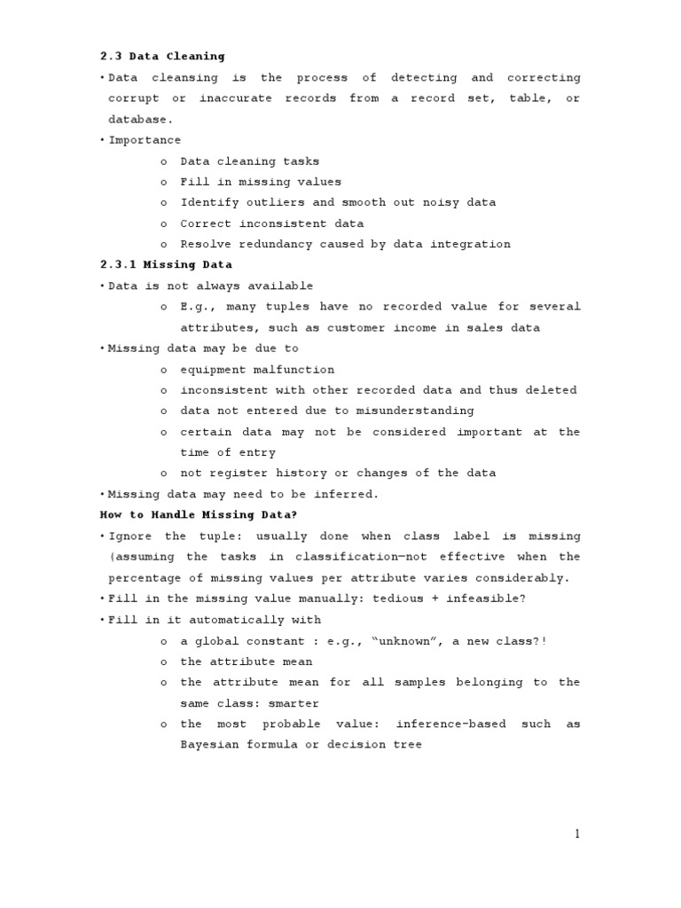 a global constant : e.g., unknown, a new class?! the attribute mean the attribute mean for all samples belonging to the same class: smarter the most probable value: inference-based such as Bayesian formula or decision tree