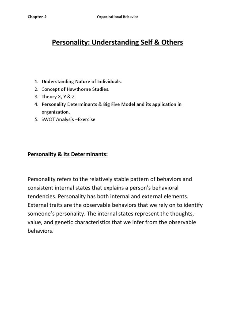 Understanding Nature of Individuals. Concept of Hawthorne Studies. Theory X, Y & Z. Personality Determinants & Big Five Model and its application in organization. 5. SWOT Analysis Exercise