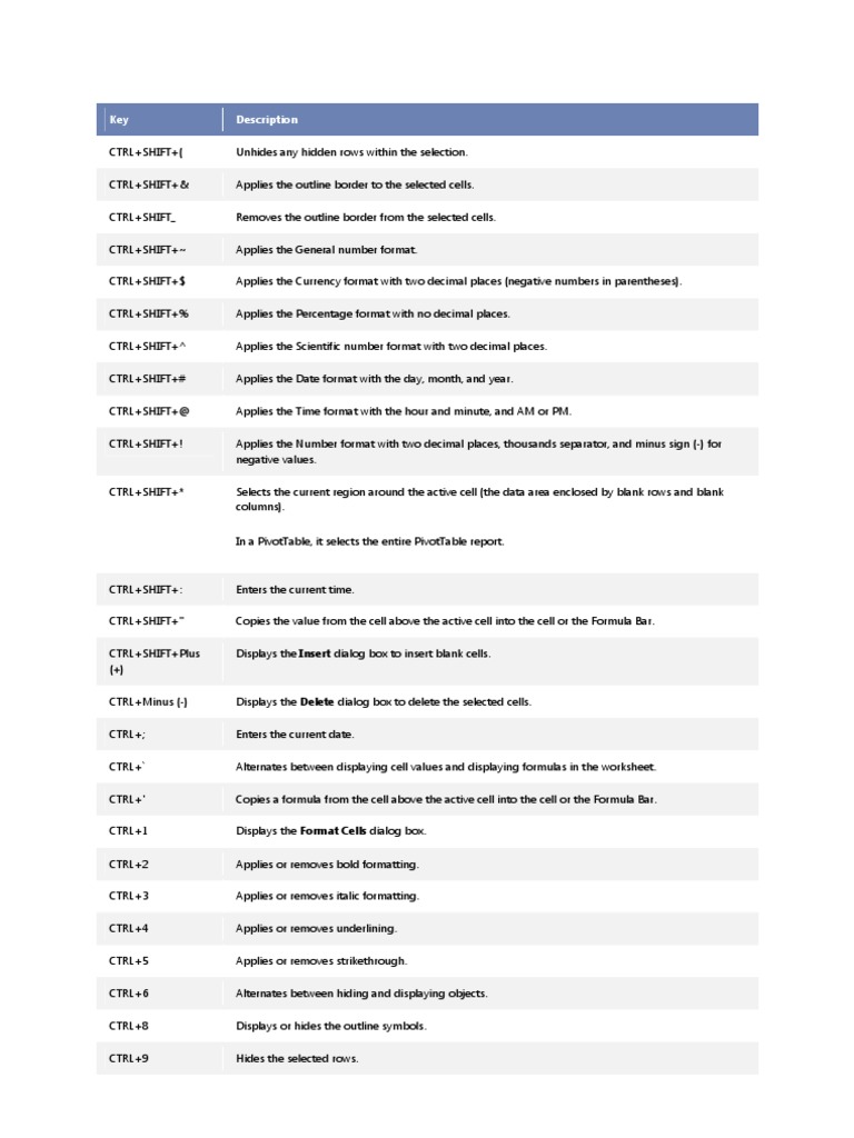 Description Unhides any hidden rows within the selection. Applies the outline border to the selected cells. Removes the outline border from the selected cells. Applies the General number format. Applies the Currency format with two decimal places (negative numbers in parentheses). Applies the Percentage format with no decimal places. Applies the Scientific number format with two decimal places. Applies the Date format with the day, month, and year. Applies the Time format with the hour and minute, and AM or PM. Applies the Number format with two decimal places, thousands separator, and minus sign (-) for negative values. Selects the current region around the active cell (the data area enclosed by blank rows and blank columns). In a PivotTable, it selects the entire PivotTable report.