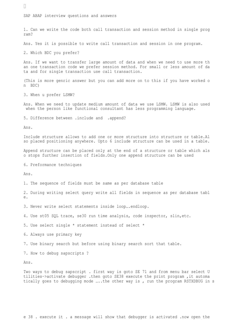 Can we write the code both call transaction and session method in single prog ram? Ans. Yes it is possible to write call transaction and session in one program. 2. Which BDC you prefer? Ans. If we want to transfer large amount of data and when we need to use more th an one transaction code we prefer session method. For small or less amount of da ta and for single transaction use call transaction. (This is more genric answer but you can add more on to this if you have worked o n BDC) 3. When u prefer LSMW? Ans. When we need to update medium amount of data we use LSMW. LSMW is also used when the person like functional consultant has less programming language. 5. Difference between .include and .append? Ans. Include structure allows to add one or more structure into structure or table.Al so placed positioning anywhere. Upto 6 include structure can be used in a table. Append structure can be placed only at the end of a structure or table which als o stops further insertion of fields.Only one append structure can be used 6. Preformance techniques Ans. 1. The sequence of fields must be same as per database table 2. During writing select query write all fields in sequence as per database tabl e. 3. Never write select statements inside loop.endloop. 4. Use st05 SQL trace, se30 run time analysis, code inspector, slin,etc. 5. Use select single * statement instead of select * 6. Always use primary key 7. Use binary search but before using binary search sort that table. 7. How to debug sapscripts ? Ans. Two ways to debug sapscript . first way is goto SE 71 and from menu bar select U tilities->activate debugger .then goto SE38 execute the print program ,it automa tically goes to debugging mode ..the other way is , run the program RSTXDBUG in s