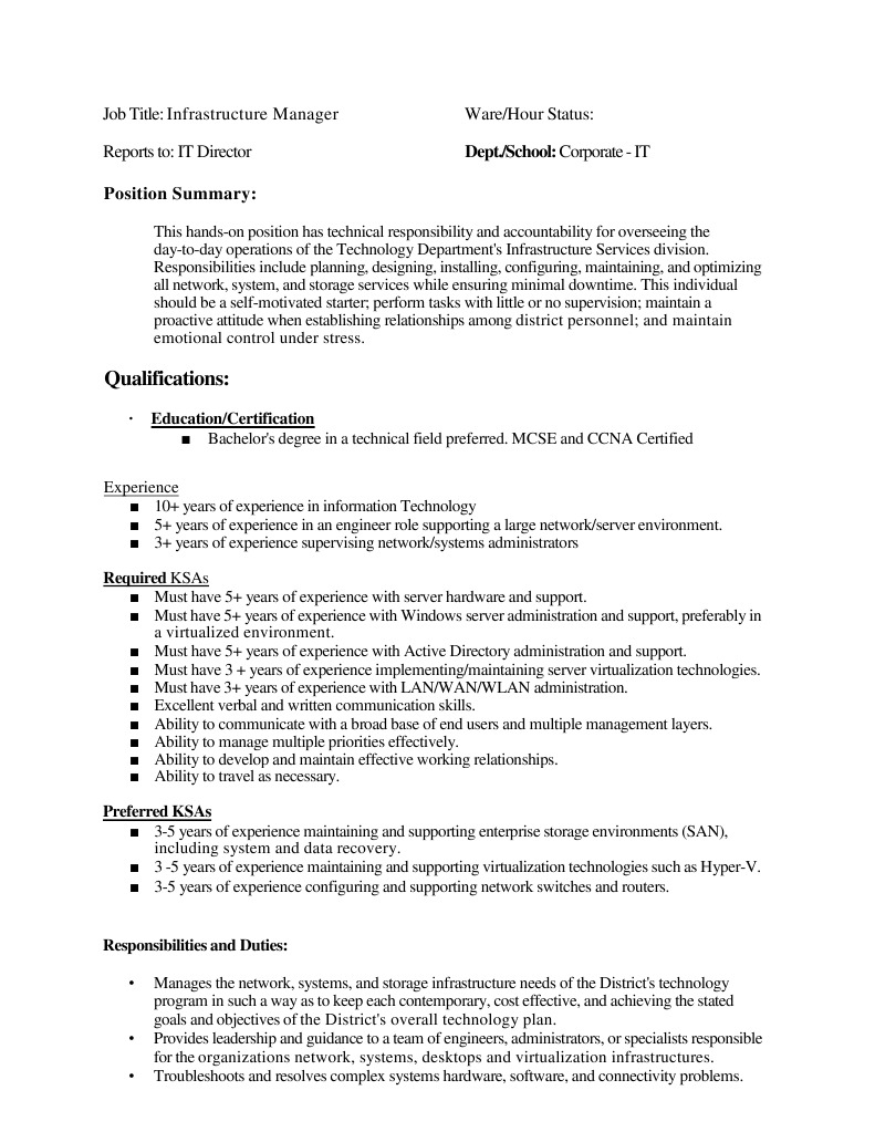 Job Title: Infrastructure Manager Reports to: IT Director Position Summary: