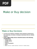 While cost is seldom the only criterion used in a make-or-buy decision, simple break-even analysis can be an effective way to quickly surmise the cost implications within a decision. Suppose that a firm can purchase equipment for in-house use for $250,000 and produce the needed parts for $10 each. Alternatively, a supplier could produce and ship the part for $15 each. Ignoring the cost of negotiating a contract with the supplier, the simple break-even point could easily be computed: $250,000 + $10Q = $15Q $250,000 = $15Q $10Q $250,000 = $5Q 50,000 = Q Therefore, it would be more cost effective for a firm to buy the part if demand is less than 50,000 units, and make the part if demand exceeds 50,000 units. However, if the firm had enough idle capacity to produce the parts, the fixed cost of $250,000 would not be incurred (meaning it is not an incremental cost), making the prospect of making the part too cost efficient to ignore. Stanley Gardiner and John Blackstone's 1991 paper in the International Journal of Purchasing and Materials Management presented the contribution-per-constraint-minute (CPCM) method of make-or-buy analysis, which makes the decision based on the theory of constraints. They also used this approach to determine the maximum permissible component price (MPCP) that a buyer should pay when outsourcing. In 2005 Jaydeep Balakrishnan and Chun Hung Cheng noted that Gardiner and Blackstone's method did not guarantee a best solution for a complicated makeor-buy problem. Therefore, they offer an updated, enhanced approach using spreadsheets with built-in liner programming (LP) capability to provide "what if" analyses to encourage efforts toward finding an optimal solution. Firms have started to realize the importance of the make-or-buy decision to overall manufacturing strategy and the implication it can have for employment levels, asset levels, and core competencies. In response to this, some firms have adopted total cost of ownership (TCO) procedures for incorporating non-price considerations into the make-or-buy decision.