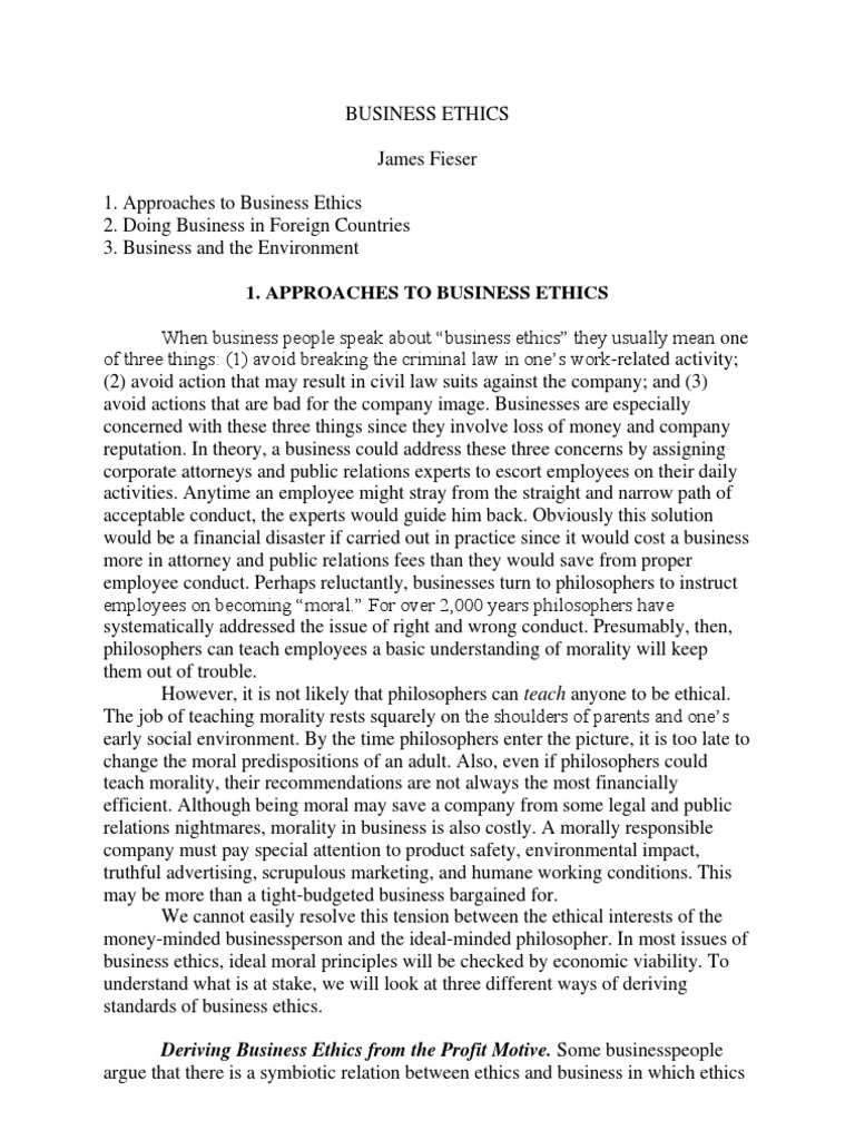 interest, bribes, and political contributions. Consider the following issues from Johnson and Johnson's Credo: We are responsible to our employees, the men and women who work with us throughout the world. Everyone must be considered as an individual. We must respect their dignity and recognize their merit. They must have a sense of security in their jobs. Compensation must be fair and adequate, and working conditions clean, orderly and safe. We must be mindful of ways to help our employees fulfill their family responsibilities. Although corporate codes of ethics are often viewed cynically as attempts to foster good public relations or to reduce legal liability, a corporate code of ethics is a reasonable model for understanding how we should articulate moral principles and introduce them into business practice. The practical advantage of this approach is that it directly stipulates the morality of certain action types, without becoming ensnared in the problem of deriving particular actions from more abstract principles, such as the harm principle. But, the limitation of the corporate code model is that the principles offered will appear to be merely rules of prudence or good manners unless we can establish their distinctly moral character. And this requires relying on more general principles of ethic described above, which, weve seen, comes with its own set of problems. Conclusion. Weve looked at three approaches to business ethics, and weve seen that all three have limitations. If we hope to find an approach to business ethics that is free from conceptual problems, we will not likely find any. Ethics is a complex subject and its history is filled with diverse theories that are systematically refuted by rival theories. So, we should expect to find controversies when applying ethics to the specific practices of business. However, following any of the above three approaches to business ethics will bring us closer to acceptable moral behavior than we might otherwise be. Close attention to ones profit motive and the moral interests of consumers might in fact generate some morally responsible business decisions. We can indeed find additional moral guidance by looking at the laws that apply specifically to businesses. In gray areas of moral controversy that are not adequately addressed profit motives and the law, we can turn for guidance to a variety of general and specific moral principles. In addition to the above three approaches to business ethics, it also helps to examine stories of businesses that have been morally irresponsible. By citing specific cases deceptive advertising, environmental irresponsibility, or unsafe products, we can learn by example what we should not do. Such cases often reveal blatantly crude, insensitive, or reckless attitudes of businesses, which we can view as warning signs of unethical conduct. Study Questions for Approaches to Business Ethics Introduction