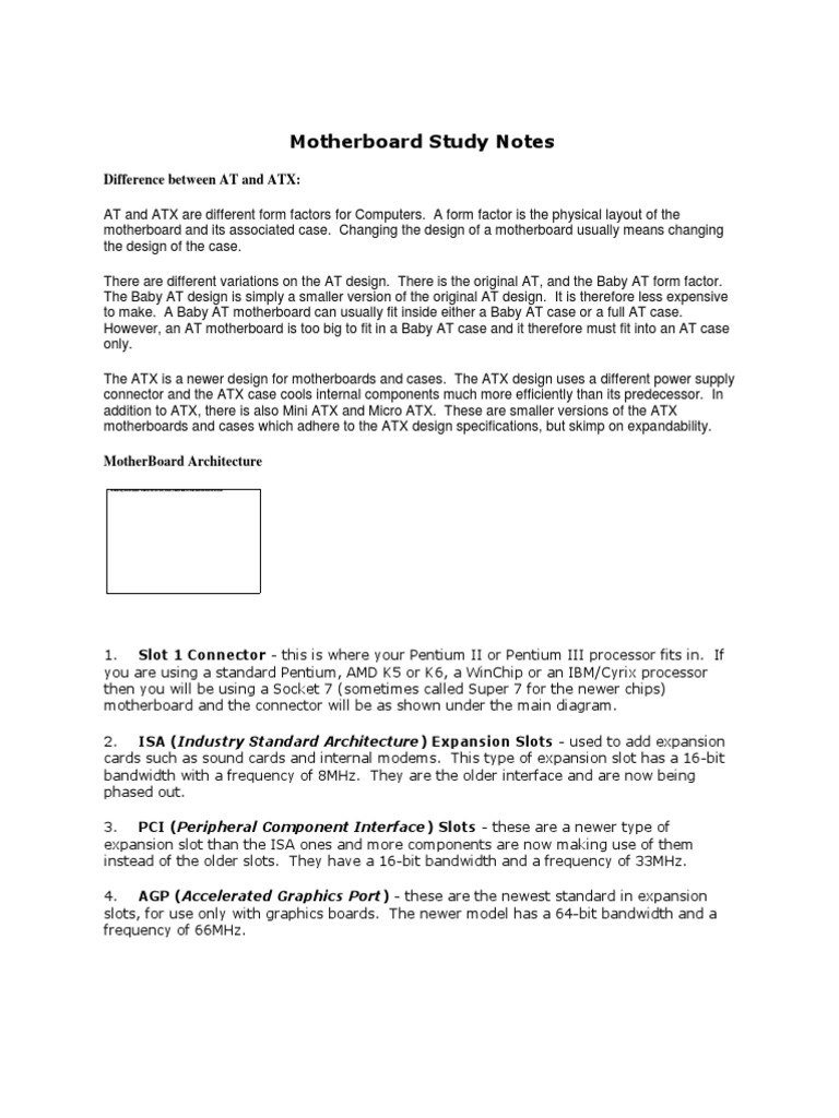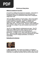 Difference between AT and ATX: AT and ATX are different form factors for Computers. A form factor is the physical layout of the motherboard and its associated case. Changing the design of a motherboard usually means changing the design of the case. There are different variations on the AT design. There is the original AT, and the Baby AT form factor. The Baby AT design is simply a smaller version of the original AT design. It is therefore less expensive to make. A Baby AT motherboard can usually fit inside either a Baby AT case or a full AT case. However, an AT motherboard is too big to fit in a Baby AT case and it therefore must fit into an AT case only. The ATX is a newer design for motherboards and cases. The ATX design uses a different power supply connector and the ATX case cools internal components much more efficiently than its predecessor. In addition to ATX, there is also Mini ATX and Micro ATX. These are smaller versions of the ATX motherboards and cases which adhere to the ATX design specifications, but skimp on expandability. MotherBoard Architecture