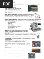 5. Memory Slots - the ones shown are DIMM (Dual Inline Memory Module) slots. Used to add memory to your computer. 6. Jumpers - these are used to configure the options on your motherboard, such as processor voltages etc. The jumper is placed over two pins to cause an electrical connection. Your motherboard manual should tell you the settings for each jumper. 7. Floppy disk and Primary/Secondary IDE channels - used to interface you hard drives, CD-ROMS and floppy drives to your motherboard. The smaller connector is for the floppy drive, and the two larger ones are for IDE (Integrated Drive Electronics) devices such as hard drives and CD-ROM drives. Up to two devices can be used from one channel, so on this motherboard you could have up to two floppy drives with four IDE devices. 8. Front Panel Connectors - these connect to the lights on the front of your system case to notify you of hard disk access, power etc. If you have an ATX style case then a power connector also fits here. The wires that should be connected to these come from the front of the case. 9. Real-Time Clock battery - allows the computer to retain the time when it is powered down. Also retains configuration data from when you first set up your computer. 10. BIOS EEPROM (Basic Input-Output System Electrically Erasable Programmable Read-Only Memory) - The BIOS configures the system resources on your system, and performs the self-check procedure each time you switch on your PC. 11. Ports - connects external peripherals to the system such as a keyboard, mouse and printer. Most modern systems will have one each of PS/2 keyboard and mouse connectors, two serial ports, one parallel port and two Universal Serial Bus (USB) ports. 12. Voltage Regulation - these components help to regulate the power supply to prevent 'spikes' when the power is switched on. 13. Power Supply Connector - this is where the power arrives from your case's PSU (Power Supply Unit). The one shown on this board is an ATX style connector and supports extra features such as auto shut-down and energy saving compatibility. The older AT style connectors have only a single row of pins and don't support these extra features.
