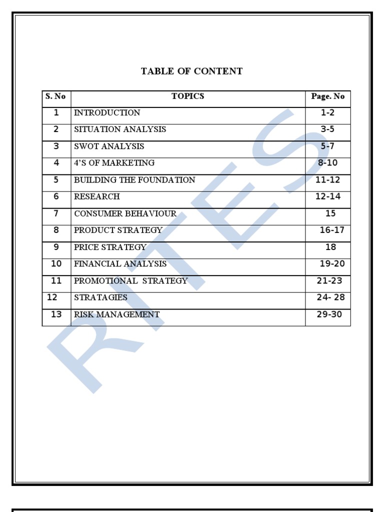 S. No 1 2 3 4 5 6 7 8 9 10 11 12 13 INTRODUCTION SITUATION ANALYSIS SWOT ANALYSIS 4S OF MARKETING BUILDING THE FOUNDATION RESEARCH CONSUMER BEHAVIOUR PRODUCT STRATEGY PRICE STRATEGY FINANCIAL ANALYSIS PROMOTIONAL STRATEGY STRATAGIES RISK MANAGEMENT TOPICS Page. No 1-2 3-5 5-7 8-10 11-12 12-14 15 16-17 18 19-20 21-23 24- 28 29-30