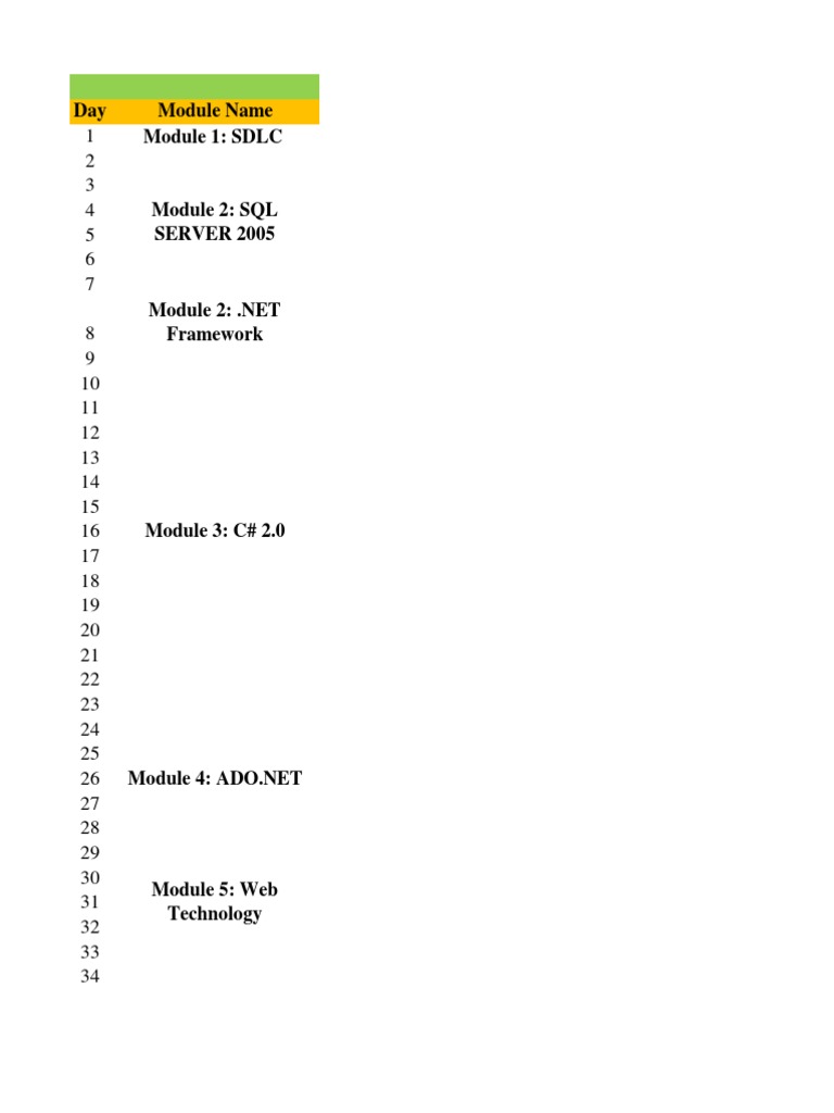 NET DAY WISE SHEDULE Day 1 2 3 4 5 6 7 8 9 10 11 12 13 14 15 16 17 18 19 20 21 22 23 24 25 26 27 28 29 30 31 32 33 34 Module Name Module 1: SDLC