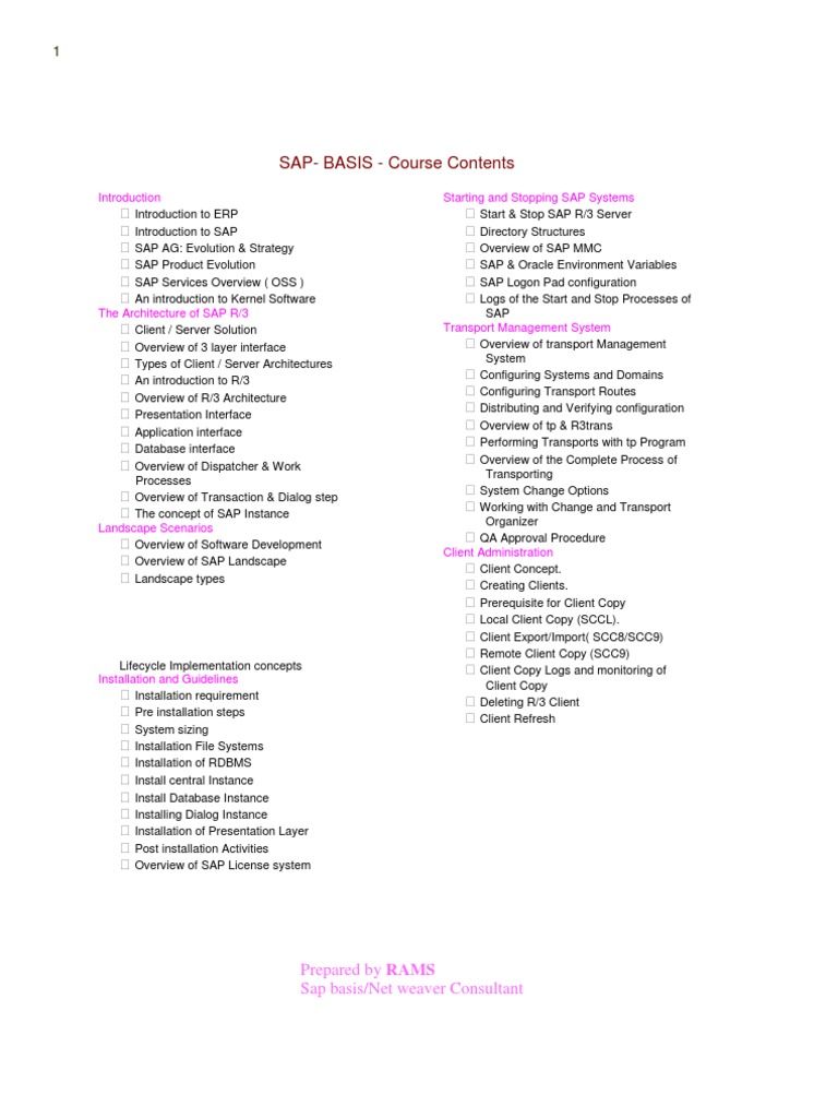 Introduction Introduction to ERP Introduction to SAP SAP AG: Evolution & Strategy SAP Product Evolution SAP Services Overview ( OSS ) An introduction to Kernel Software The Architecture of SAP R/3 Client / Server Solution Overview of 3 layer interface Types of Client / Server Architectures An introduction to R/3 Overview of R/3 Architecture Presentation Interface Application interface Database interface Overview of Dispatcher & Work Processes Overview of Transaction & Dialog step The concept of SAP Instance Landscape Scenarios Overview of Software Development Overview of SAP Landscape Landscape types Starting and Stopping SAP Systems Start & Stop SAP R/3 Server Directory Structures Overview of SAP MMC SAP & Oracle Environment Variables SAP Logon Pad configuration Logs of the Start and Stop Processes of SAP Transport Management System Overview of transport Management System Configuring Systems and Domains Configuring Transport Routes Distributing and Verifying configuration Overview of tp & R3trans Performing Transports with tp Program Overview of the Complete Process of Transporting System Change Options Working with Change and Transport Organizer QA Approval Procedure Client Administration Client Concept. Creating Clients. Prerequisite for Client Copy Local Client Copy (SCCL). Client Export/Import( SCC8/SCC9) Remote Client Copy (SCC9) Client Copy Logs and monitoring of Client Copy Deleting R/3 Client Client Refresh