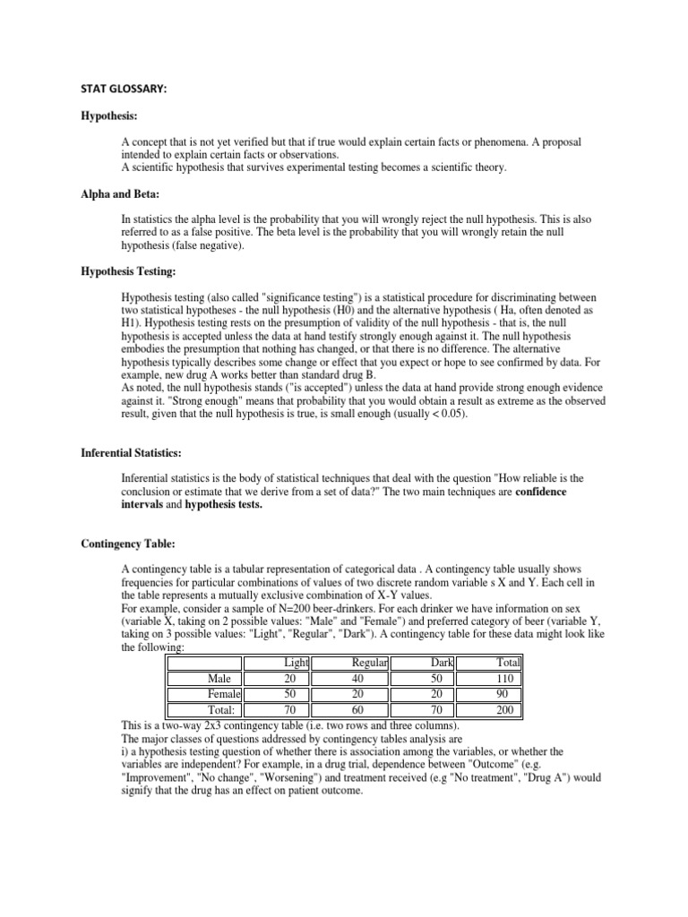 Contingency Table: A contingency table is a tabular representation of categorical data . A contingency table usually shows frequencies for particular combinations of values of two discrete random variable s X and Y. Each cell in the table represents a mutually exclusive combination of X-Y values. For example, consider a sample of N=200 beer-drinkers. For each drinker we have information on sex (variable X, taking on 2 possible values: "Male" and "Female") and preferred category of beer (variable Y, taking on 3 possible values: "Light", "Regular", "Dark"). A contingency table for these data might look like the following: Light Regular Dark Total Male 20 40 50 110 Female 50 20 20 90 Total: 70 60 70 200 This is a two-way 2x3 contingency table (i.e. two rows and three columns). The major classes of questions addressed by contingency tables analysis are i) a hypothesis testing question of whether there is association among the variables, or whether the variables are independent? For example, in a drug trial, dependence between "Outcome" (e.g. "Improvement", "No change", "Worsening") and treatment received (e.g "No treatment", "Drug A") would signify that the drug has an effect on patient outcome.