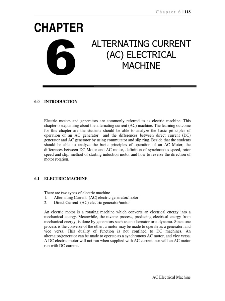 Electric motors and generators are commonly referred to as electric machine. This chapter is explaining about the alternating current (AC) machine. The learning outcome for this chapter are the students should be able to analyze the basic principles of operation of an AC generator and the differences between direct current (DC) generator and AC generator by using commutator and slip ring. Beside that the students should be able to analyze the basic principles of operation of an AC Motor, the differences between DC Motor and AC motor, definition of synchronous speed, rotor speed and slip, method of starting induction motor and how to reverse the direction of motor rotation.