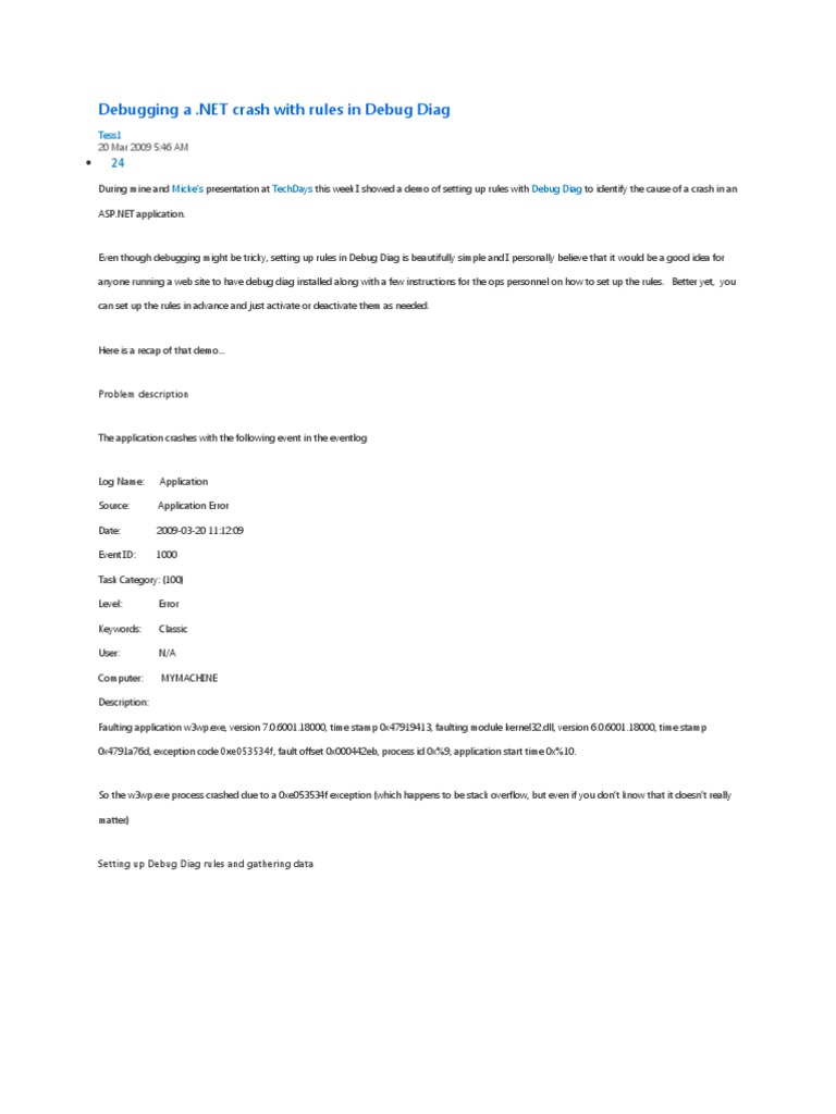 During mine and Mickes presentation at TechDays this week I showed a demo of setting up rules with Debug Diag to identify the cause of a crash in an ASP.NET application.