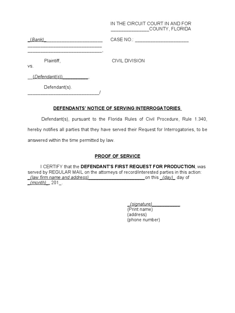 ____________________________/ DEFENDANTS NOTICE OF SERVING INTERROGATORIES Defendant(s), pursuant to the Florida Rules of Civil Procedure, Rule 1.340, hereby notifies all parties that they have served their Request for Interrogatories, to be answered within the time permitted by law. PROOF OF SERVICE I CERTIFY that the DEFENDANTS FIRST REQUEST FOR PRODUCTION, was served by REGULAR MAIL on the attorneys of record/interested parties in this action: _(law firm name and address)______________________on this _(day)_ day of _(month)_, 201_. CASE NO.: _____________________