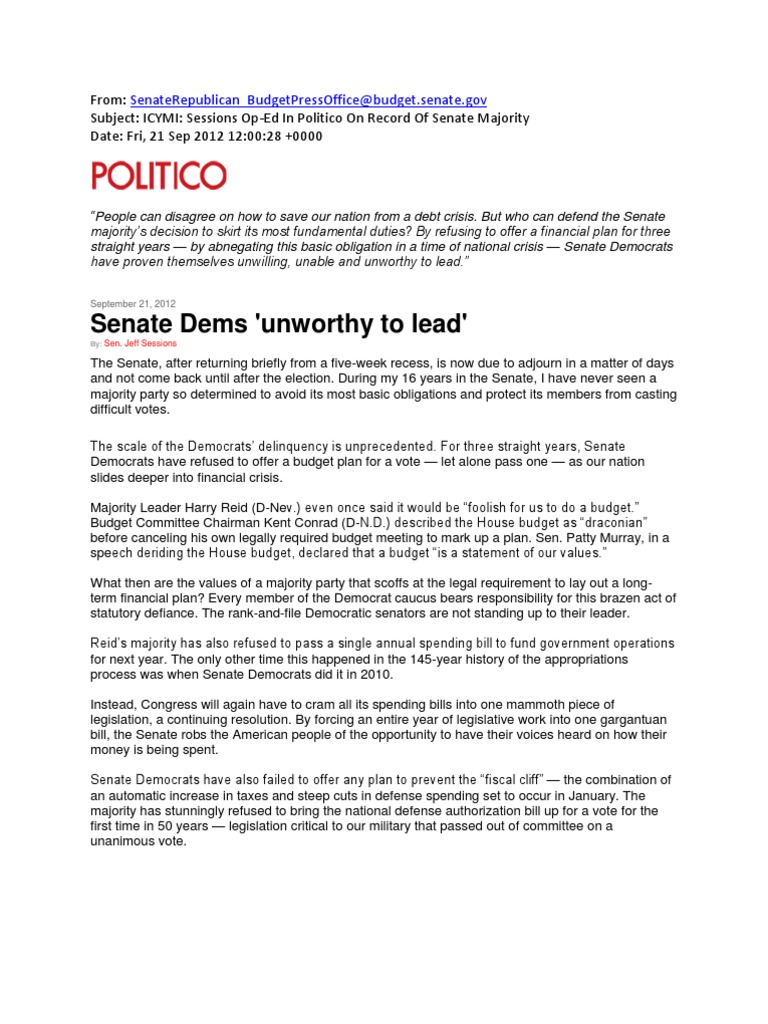 gov Subject: ICYMI: Sessions Op-Ed In Politico On Record Of Senate Majority Date: Fri, 21 Sep 2012 12:00:28 +0000