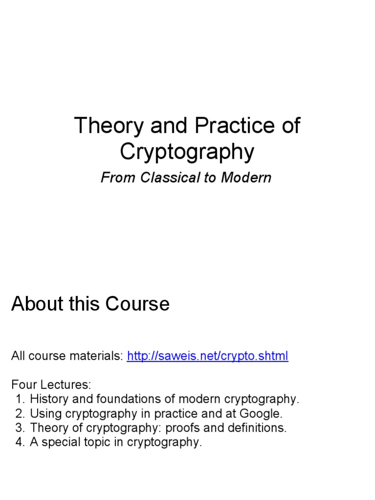 All course materials: http://saweis.net/crypto.shtml Four Lectures: 1. History and foundations of modern cryptography. 2. Using cryptography in practice and at Google. 3. Theory of cryptography: proofs and definitions. 4. A special topic in cryptography.