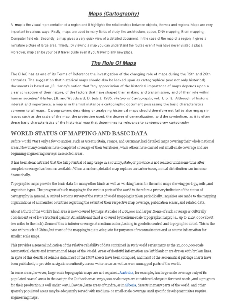 A map is the visual representation of a region and it highlights the relationships between objects, themes and regions. Maps are very important in various ways. Firstly, maps are used in many fields of study like architecture, space, DNA mapping, Brain mapping, Computer field etc. Secondly, a map gives a very quick view of a detailed document. In the case of the map of a region, it gives a miniature picture of large area. Thirdly, by viewing a map you can understand the routes even if you have never visited a place. Moreover, map can be your best travel guide even if you travel to any new place.
