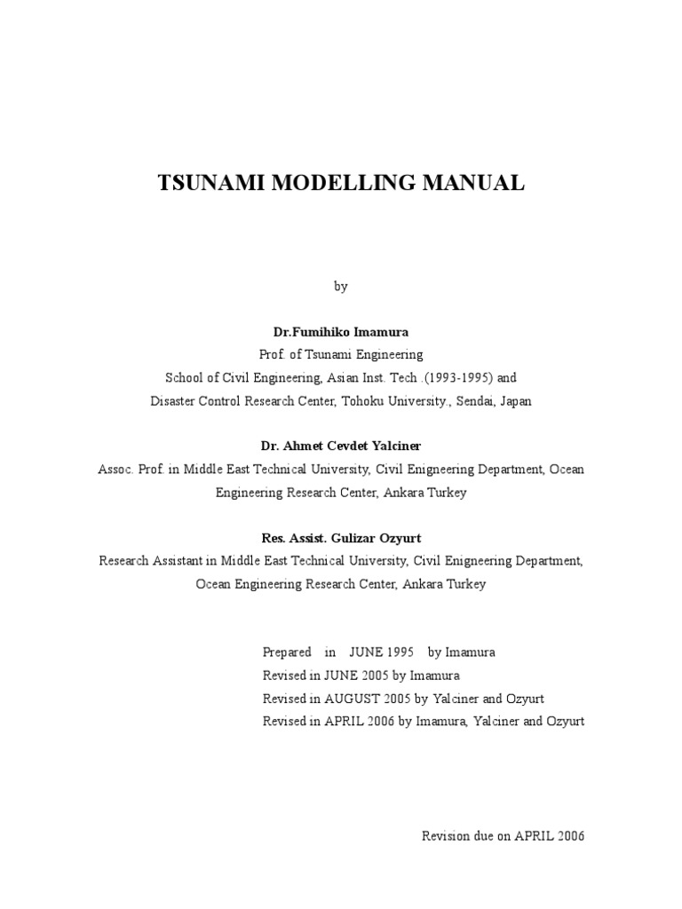 The mentioned manual is revised and extended by Dr. Fumihiko Imamura tohoku Univesity, Japan, Dr. Ahmet Cevdet Yalciner and Research Assistant Civil Eng. Gulizar Ozyurt, Middle East Technical University, Turkey by including the manual for TUNAMI-N2, processing bathymetry file, input procedures and a glossary.