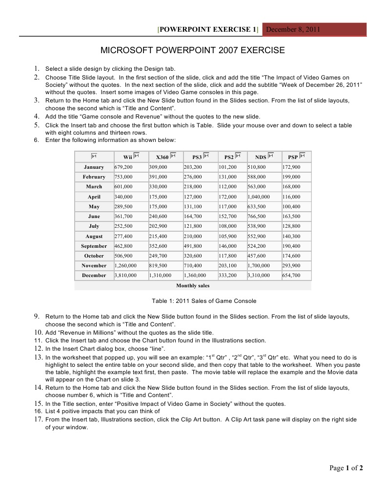 Society without the quotes. In the next section of the slide, click and add the subtitle Week of December 26, 2011 without the quotes. Insert some images of Video Game consoles in this page. 3. Return to the Home tab and click the New Slide button found in the Slides section. From the list of slide layouts, choose the second which is Title and Content. 4. Add the title Game console and Revenue without the quotes to the new slide. 5. Click the Insert tab and choose the first button which is Table. Slide your mouse over and down to select a table with eight columns and thirteen rows. 6. Enter the following information as shown below: