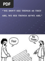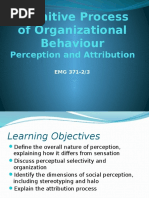 A VERY GOODMORNING TO YOU ALL : A VERY GOODMORNING TO YOU ALL PERCEPTION : PERCEPTION Concept Of Perception Perception is the cognitive process involving selecting,organising,and interpreting or attaching meaning to the events happening in the environment. Features : Features Perception is the intellectual process. Perception is the basic cognitive or psychological process. Different people perceive different things according to their psychological and intellectual behaviour. PERCEPTUAL PROCESS : PERCEPTUAL PROCESS Perceptual inputs Stimuli Perceptual Throughputs Receiving Selecting Organising Interpreting Perceptual Outputs Action Perceptual Organization : Perceptual Organization Perceptual organization deals with the manner in which selected stimuli are organized in order to make sense out of them. People organize the various stimuli on the principles of figure-ground,grouping,simplification and closure. Principles : Principles Figure ground: People tend to organise information on what is known as the figure ground principle.In this more attention is paid to phenomena which have been kept as figure and less attention is paid to phenomena kept in background. Grouping: people have a tendency to group several stimuli into recognisable pattern.people generally group various stimuli on the basis of proximity or similarity. Slide 7: Proximity:The proximity or nearness principle of grouping states that a group of stimuli that are close together will be perceived as a whole of parts or pattern of parts belonging together. For eg. All employees working in a particular department may be grouped together because of physical proximity. Slide 8: Similarity: The principle of similarity states that the greater the similarity of the stimuli greater is the tendency to perceive them as a common group. For eg All the workers may be perceived to have the same opinions about the management because they are grouped together on the basis of similarity. : Simplification: whenever people are overloaded with information, they try to simplify it to make it more meaningful and understandable.simplifaction makes the things more understandable because the perceiver has been to reduce the complexity by eliminating some of the things which are less important. Slide 10: Closure: When faced with incomplete information,people fill up the gaps themselves to the information meaningful.For eg When managers have to make promotion decisions, they may not have complete information about the suitability of an employee for a higher position. In such cases, they rely more on the past records of the employee. INTERPERSONAL PERCEPTION : INTERPERSONAL PERCEPTION As we discussed perceptual selectivity and perceptual organisation holds true for any stimulus situation, persons or others. This situation puts emphasis on interpersonal perception in which the perceiver perceives another person and the latter becomes a stimulus for perception. There are certain factors which influence the interpersonal perception. FACTORS OF IMPERSONAL PERCEPTION ARE: : FACTORS OF IMPERSONAL PERCEPTION ARE: Factors in perceiver, Factors in perceived, Situational factors. FACTORS IN PERCEIVER: the person tries to perceive the other person according to his own personality, his mental set,attribution,first impression, halo effect and stereotyping. Slide 13: Personality: personality influences perception because of two reasons: The perceiver tries to project his personality attributes in others known as projection. The perceiver tries to fit his attitudes,beliefs,expectations to reality known as the process of selfulfilling prophecies. Slide 14: Mental set: The person tries to perceive the other person according to his/her mental set or given situation.Suppose you are contestant in a track meet and are positioning yourself in your starting blocks as you hear the prepratory commands,Get ready,Get set.when you hear the command u take off at once since you are already set. Slide 15: