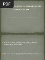 Attribution : Attribution is the process by which individuals interpret events as being caused by particular aspects in the setting around them.Attribution of causes for events influences perception.For eg.:If a person is bypassed in promotion,he may attribute the reason of his bypassing in terms that others have been promoted not because of their ability but because of their being close with high ups. Slide 16: First impression:It is very common that people evaluate on the basis of first impression.The evaluation based first impression may be correct if it is based on adequate and significant evidence.Since first impression evaluation is not based on adequate information,it may not be true reflection of people being perceived. Slide 17: Halo effect:The halo in such a case serves as a screen, keeping the perceiver away from actually seeing the trait he is judging The halo error is very similar to sterotyping except that in sterotyping the person is perceived according to a single category,whereas under the halo effect, the person is perceived on the basis of one trait or event. Slide 18: Stereo typing: Stereotyping occurs when the perceiver perceives a person on the basis of characterstics of the group to which he belongs.The person is not perceived as an individual.For eg. There are certain stereotyping at the international level like: Americans are materialistics and ambitious,Japanese are industrious etc.In perception individuals belonging to a particular class are likely to be perceived on the basis of characterstics of the class to which they belong. FACTORS IN PERSON PERCEIVED : FACTORS IN PERSON PERCEIVED TWO SUCH FACTORS ARE MORE COMMON: Status of the person. Visibility of his traits. Slide 20: Status:The target person may be perceived on the basis of his status and not on the basis of his actual characterstics.Thus a person having high status may be perceived to have many desirable qualities as compared to a person having low status.This may not be true. Slide 21: Visibility of traits: There are many traits which are not visible on surface,such as Honesty,loyalty etc.In such cases evaluation is to be made on the basis of ones own experience which may not be correct. SITUATIONAL FACTORS : SITUATIONAL FACTORS Situational factors also influence the perception.There may be structured of the place indicating the characterstics of person occupying it.Thus a person is likely to be perceived by a place. For eg.A person is perceived differently if he meets with other in a five star hotel as compared to an ordinary place.