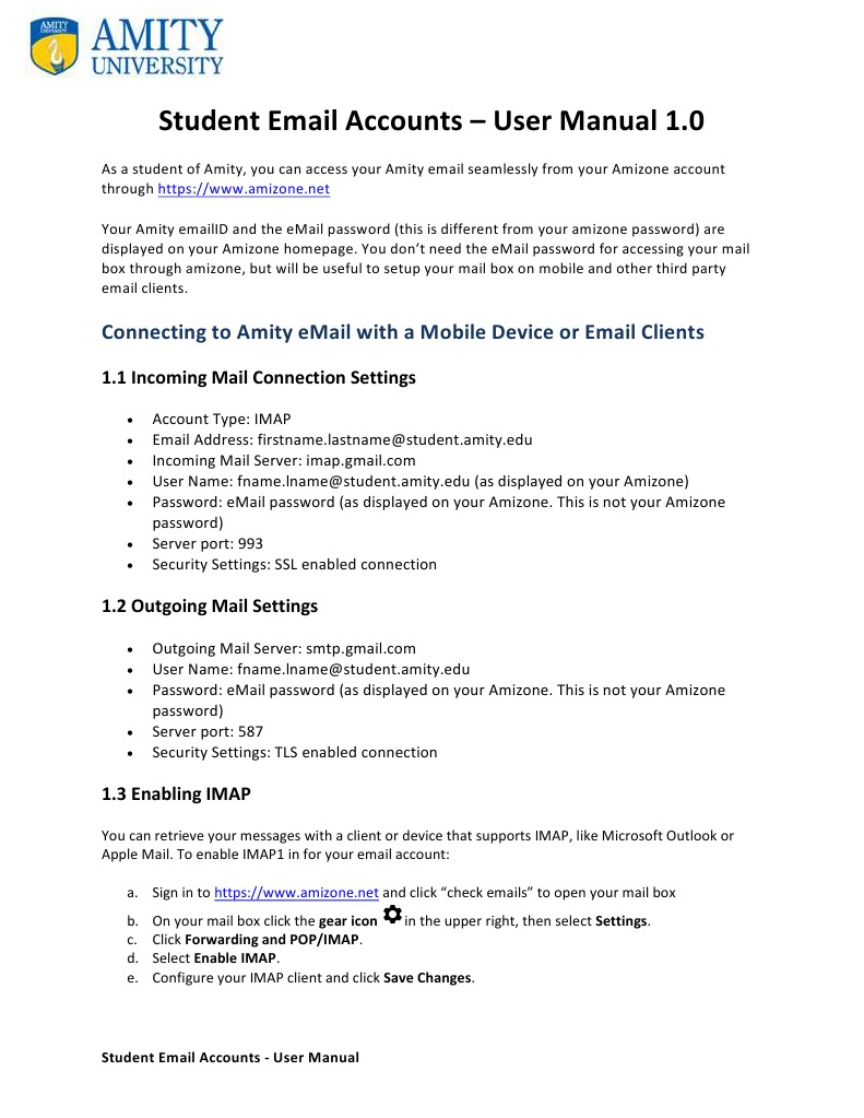 Account Type: IMAP Email Address: firstname.lastname@student.amity.edu Incoming Mail Server: imap.gmail.com User Name: fname.lname@student.amity.edu (as displayed on your Amizone) Password: eMail password (as displayed on your Amizone. This is not your Amizone password) Server port: 993 Security Settings: SSL enabled connection